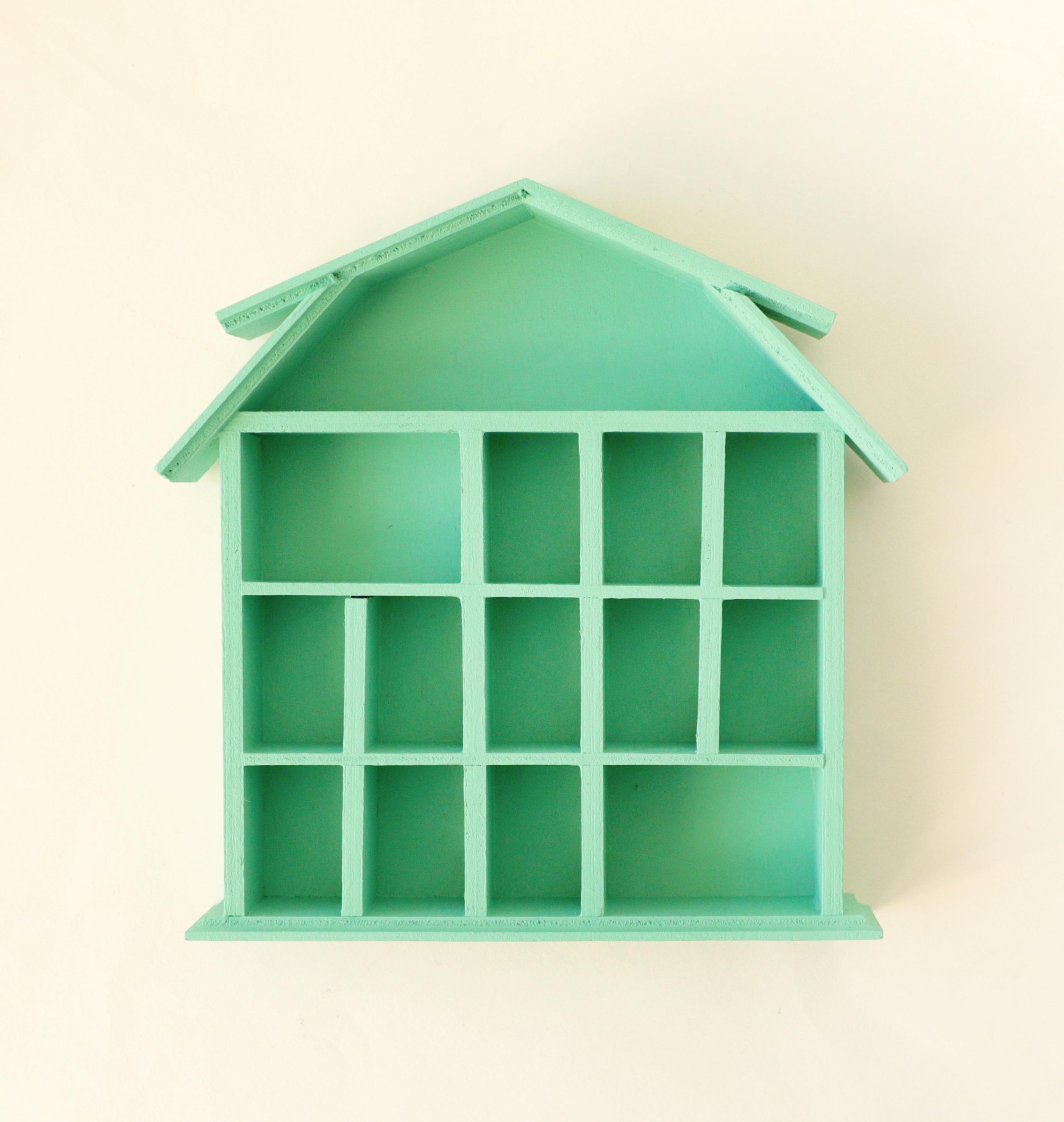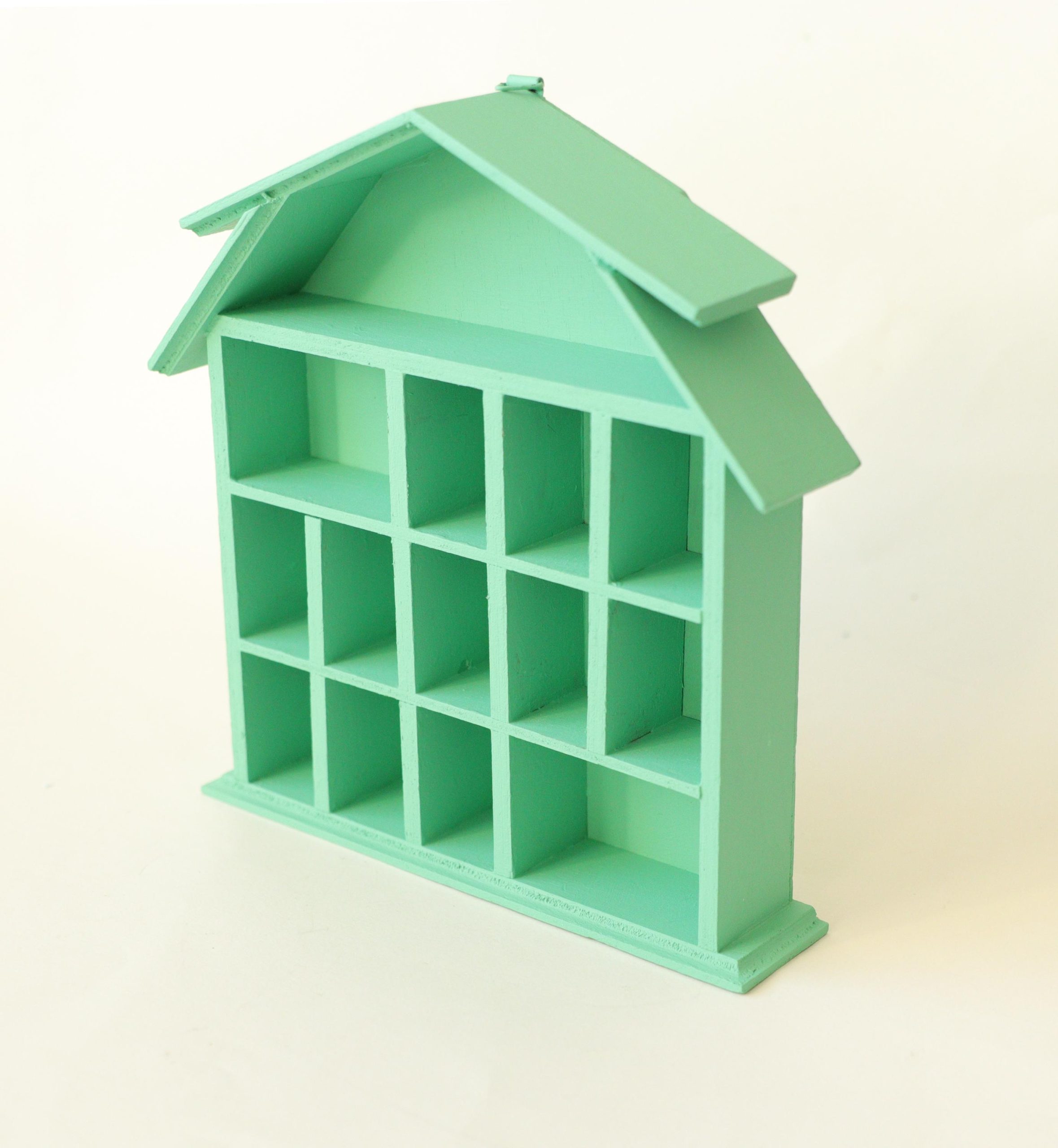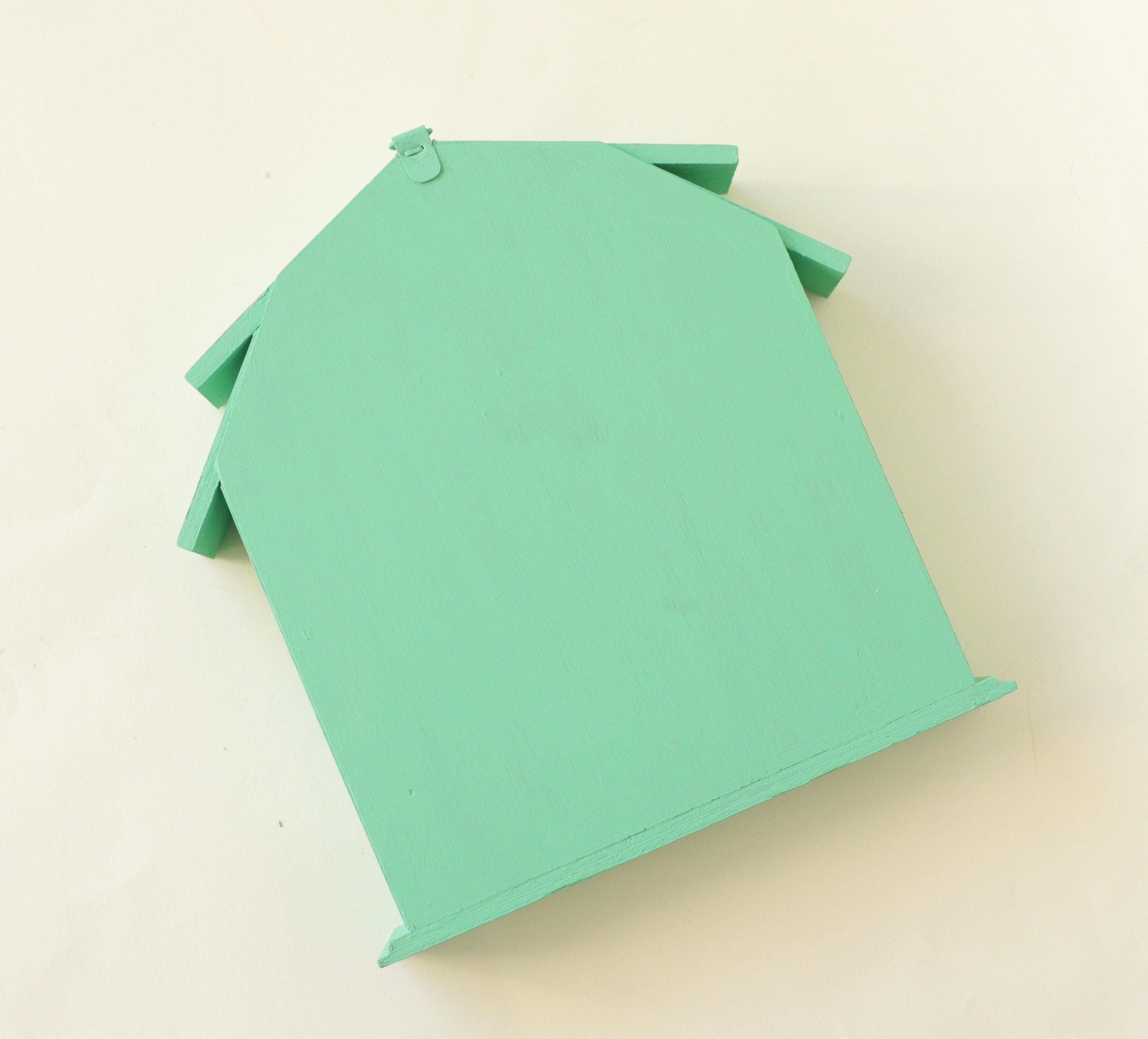 This wooden trinket house shelf has been painted by me with a jade green! Measures 7×7” and 1” deep.