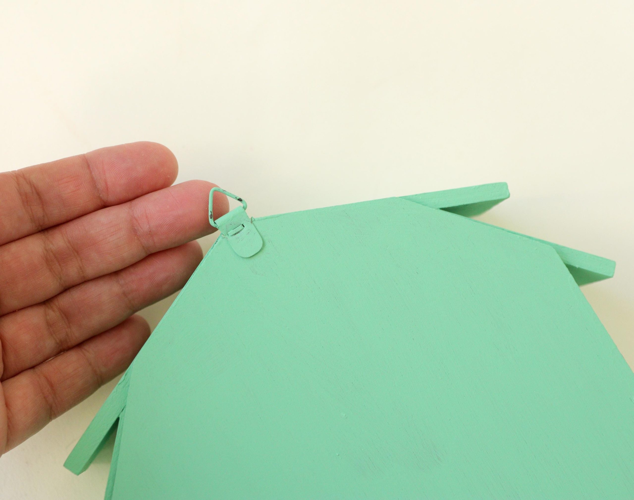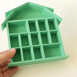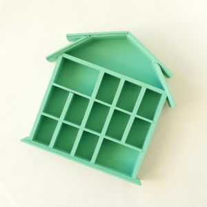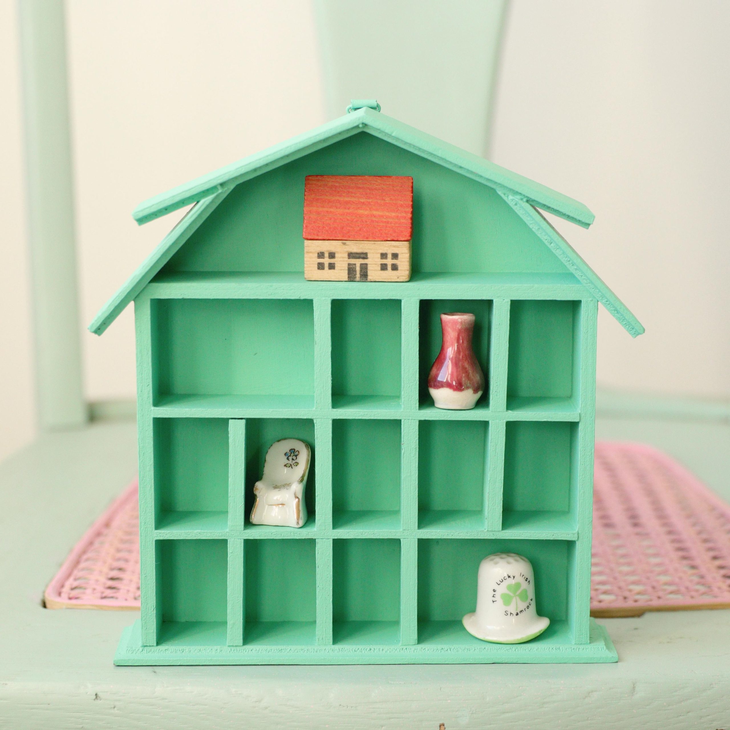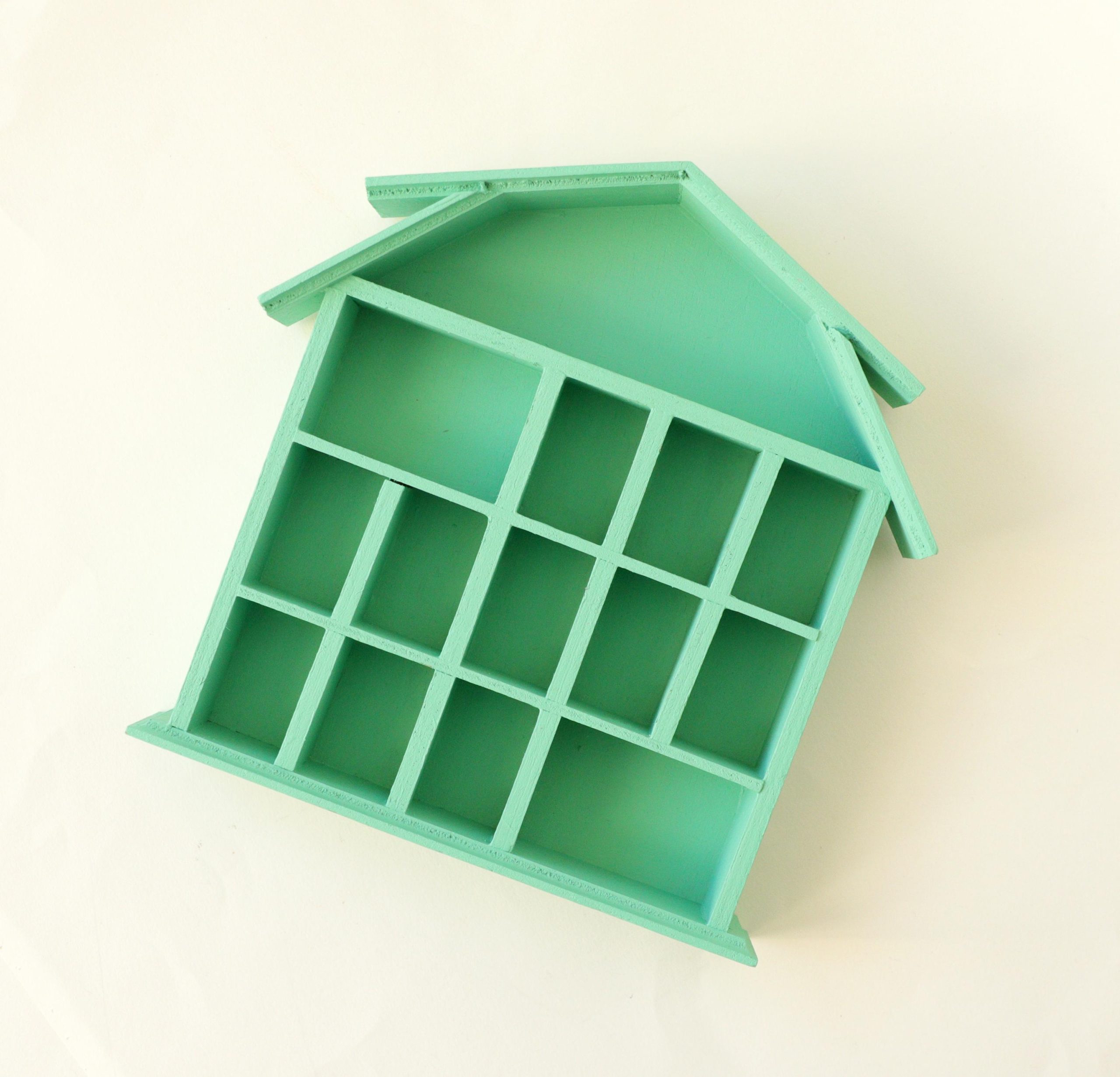 This wooden trinket house shelf has been painted by me with a jade green! Measures 7×7” and 1” deep.